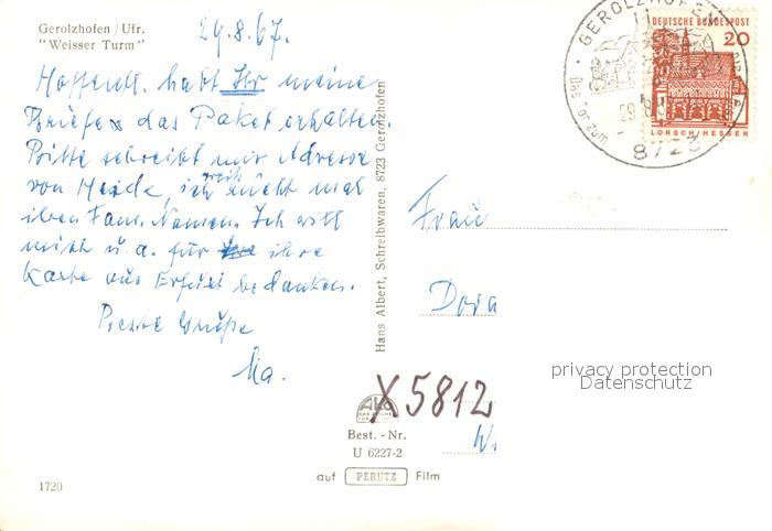 73736771 alte Postkarte Gerolzhofen Weisser Turm postalisch gelaufen Erhaltung siehe scans [FriedD77] KatCode: 11110009678134