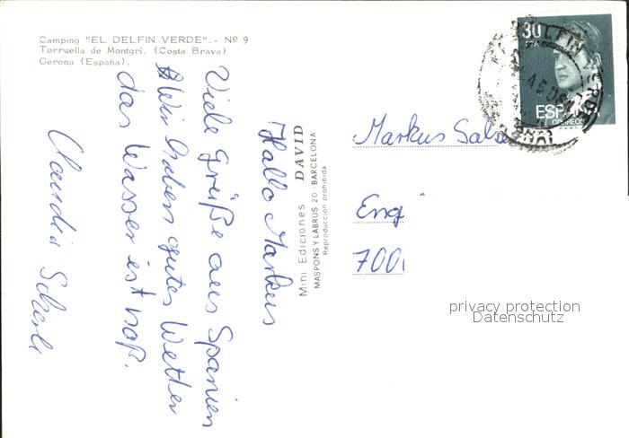 old postcard Gerona Camping El Delfin Verde postalisch gelaufen