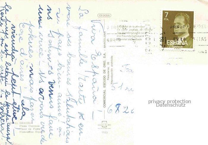 74026202 old postcard Gerona Costa Brava ES Plaza Correos postalisch gelaufen Erhaltung siehe scans [FriedD77] KatCode: 11510