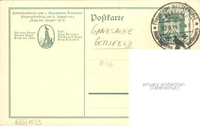 31704926 alte Postkarte Gersfeld Rhoen Flieger-Gedenktag postalisch gelaufen Ganzsache (eingedruckte Briefmarke) Erhaltung siehe scans KatCode: 11110006631010