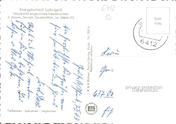 72098766 alte Postkarte Gersfeld Rhoen Kneippkurheim Ludwigstift Gastraeume Anwendungsbad postalisch gelaufen Erhaltung siehe scans KatCode: 11110006631010