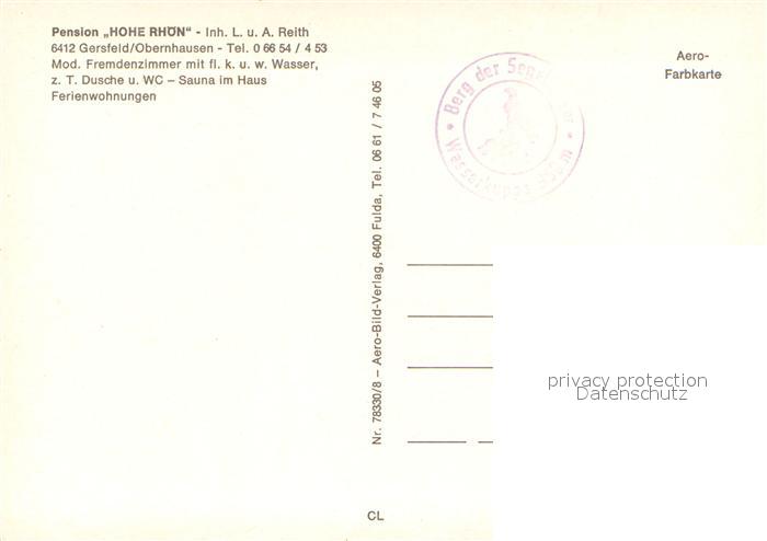 73678860 Gersfeld Rhoen Pension Hohe Rhoen Fliegerdenkmal Motorflugzeug Wasserkuppe Segelflugplatz Milseburg Rother Kuppe Guckaisee Kreuzberg Fuldaquelle postalisch nicht gelaufen Erhaltung siehe scans [FriedD77] KatCode: 11110006631010