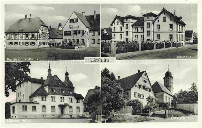 74087082 alte Postkarte Gerstetten Wuerttemberg Heidenheim BW Partie am Rathaus Schulhaus Bahnhof-Hotel Kirche postalisch gelaufen Erhaltung siehe scans [FriedD77] KatCode: 11110008135015