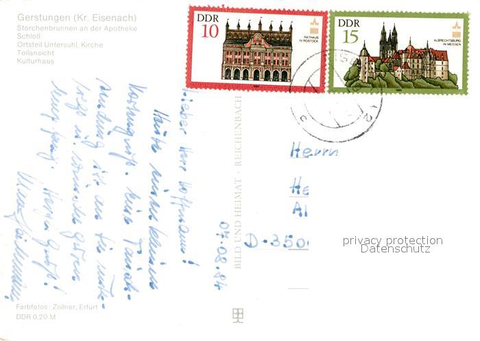 72926205 alte Postkarte Gerstungen Storchenbrunnen Schloss OT Untersuhl Kirche Kulturhaus postalisch gelaufen Erhaltung siehe scans [FriedD77] KatCode: 11110016063097