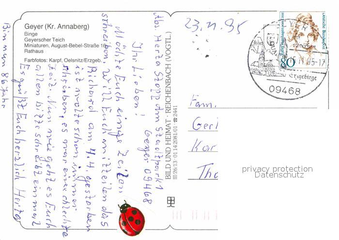 72639706 alte Postkarte Geyer Binge Geyerscher Teich Badestrand Miniaturen August Bebel Strasse Rathaus postalisch gelaufen Erhaltung siehe scans [FriedD77] KatCode: 11110014171120