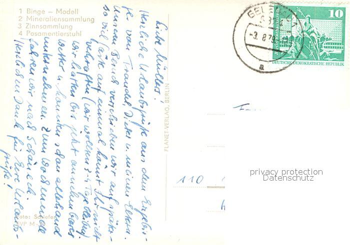 73738901 alte Postkarte Geyer Heimatmuseum Binge-Modell Mineraliensammlung Zinnsammlung Posamentierstuhl postalisch gelaufen Erhaltung siehe scans [FriedD77] KatCode: 11110014171120