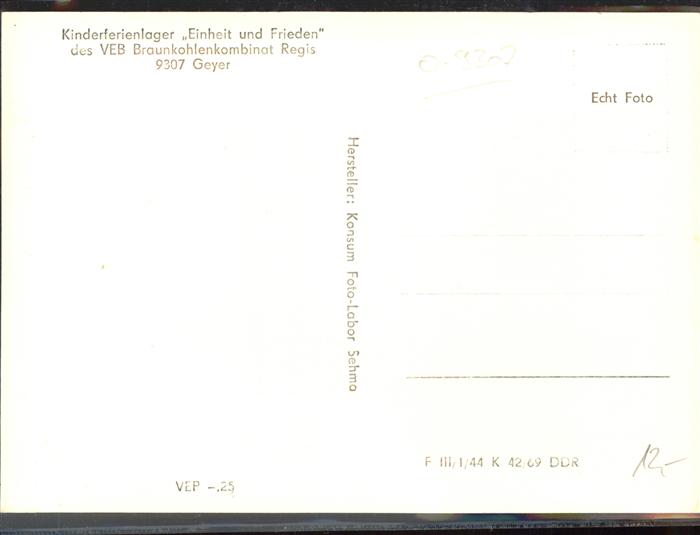 41380236 Geyer Kinderferienlager Eineit u. Frieden VEB Braunkohlenkominat Regis KatCode 11110014171120