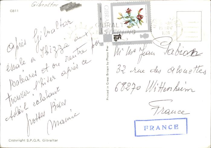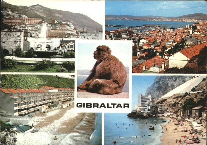 old postcard Gibraltar Panorama Fontaene Affe Strand postalisch gelaufen gute Erhaltung
