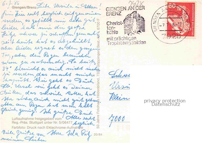 74041101 alte Postkarte Giengen Brenz Fliegeraufnahme postalisch gelaufen Erhaltung siehe scans [FriedD77] KatCode: 11110008135016