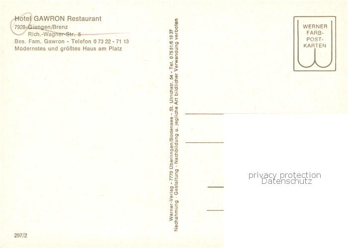 73867192 Giengen Brenz Hotel Gawron Restaurant Fremdenzimmer postalisch nicht gelaufen Erhaltung siehe scans [FriedD77] KatCode: 11110008135016