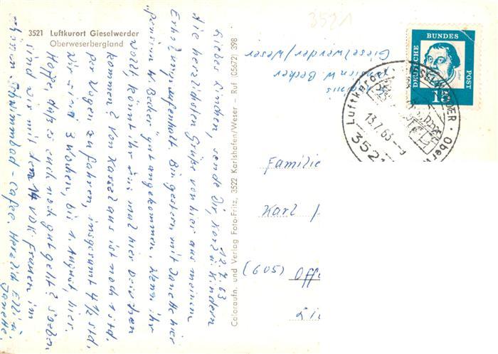 73935111 alte Postkarte Gieselwerder Fliegeraufnahmen Panorama Weserpartie Fachwerkhaus postalisch gelaufen Erhaltung siehe scans [FriedD77] KatCode: 11110006633021