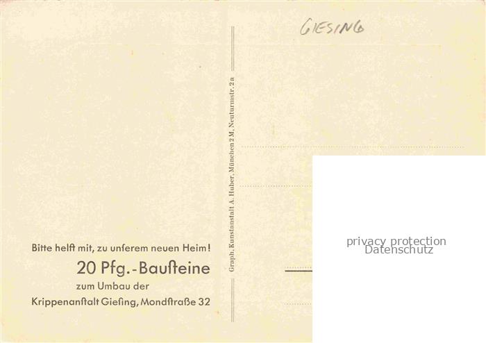 74106394 Giesing MueNCHEN Bayern 20 Pfg.-Bausteine zum Umbau der Krippenanstalt postalisch nicht gelaufen Erhaltung siehe scans [FriedD77] KatCode: 11110009162000