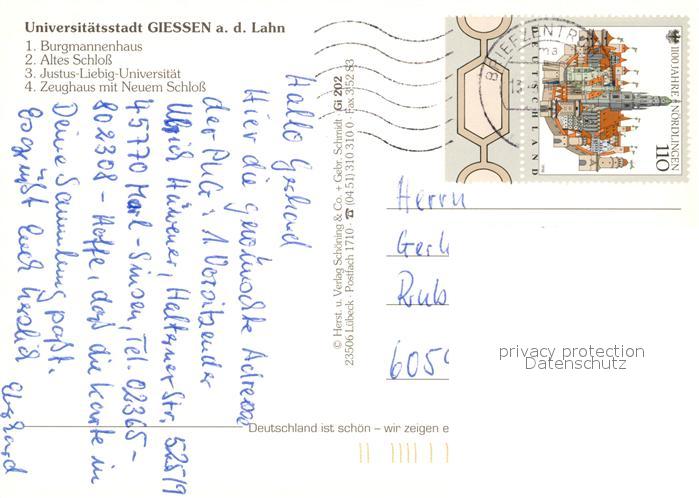 73207122 alte Postkarte Giessen Lahn Burgmannenhaus Altes Schloss Justus Liebig Universitaet Zeughaus neues Schloss postalisch gelaufen Erhaltung siehe scans [KathaD81] KatCode: 11110006531005
