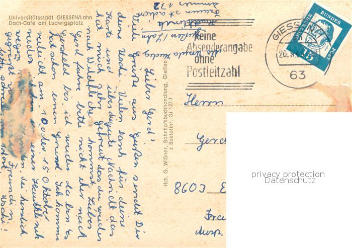 73618462 alte Postkarte Giessen Lahn Dach-Cafe am Ludwigsplatz Universitaetsstadt postalisch gelaufen Erhaltung siehe scans [FriedD77] KatCode: 11110006531005