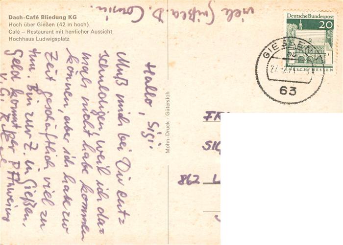 73883234 alte Postkarte Giessen Lahn Dach Cafe Bliedung Gastraum postalisch gelaufen Erhaltung siehe scans [WerneD78] KatCode: 11110006531005
