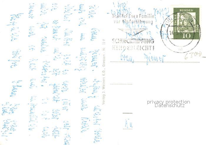 43362504 alte Postkarte Giessen Lahn Hochhaeuser Lahn Regattastrecke Johanneskirche Stadttheater Oetzberg Duensberg Gleiberg Neues Schloss postalisch gelaufen Erhaltung siehe scans [WerneD78] KatCode: 11110006531005