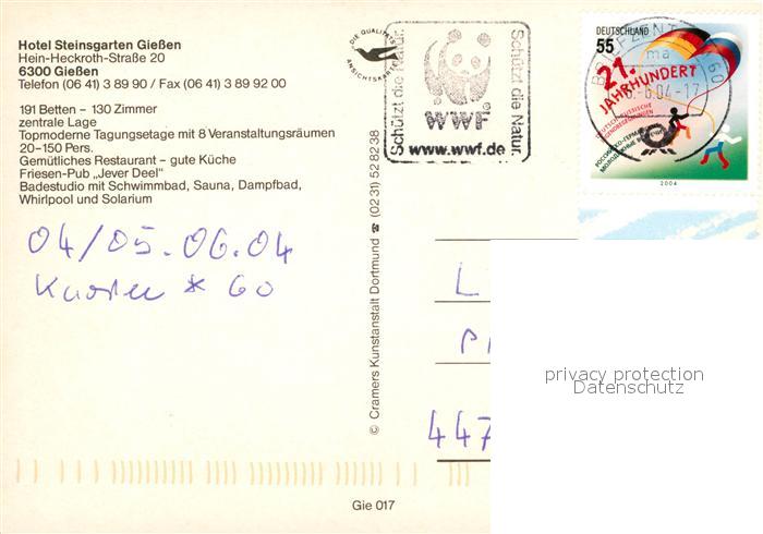 73542367 alte Postkarte Giessen Lahn Hotel Steinsgarten postalisch gelaufen Erhaltung siehe scans [KathaD81] KatCode: 11110006531005