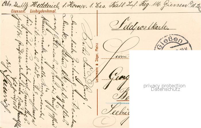 73807760 alte Postkarte Giessen Lahn Liebigdenkmal Feldpost postalisch gelaufen Erhaltung siehe scans [WerneD78] KatCode: 11110006531005