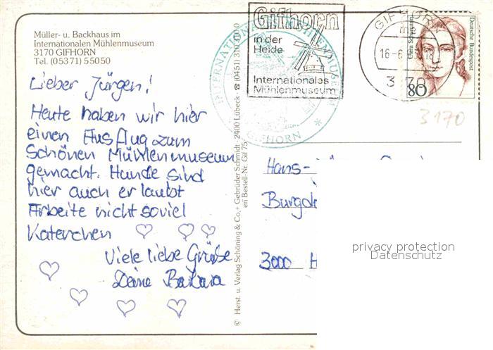 72914919 alte Postkarte Gifhorn Internationales Muehlenmuseum Muellerhaus Backhaus postalisch gelaufen Erhaltung siehe scans [FriedD77] KatCode: 11110003151009