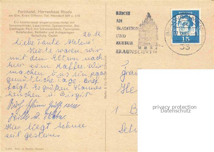74043143 alte Postkarte Gifhorn Parkhotel Herrenhaus Rhode postalisch gelaufen Erhaltung siehe scans [WerneD78] KatCode: 11110003151009