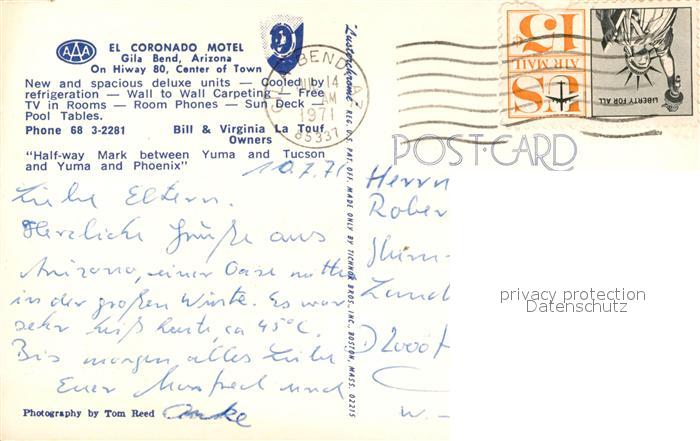 73333595 old postcard Gila Bend El Coronado Motel postalisch gelaufen Erhaltung siehe scans [FriedD77] KatCode: 14140030000000