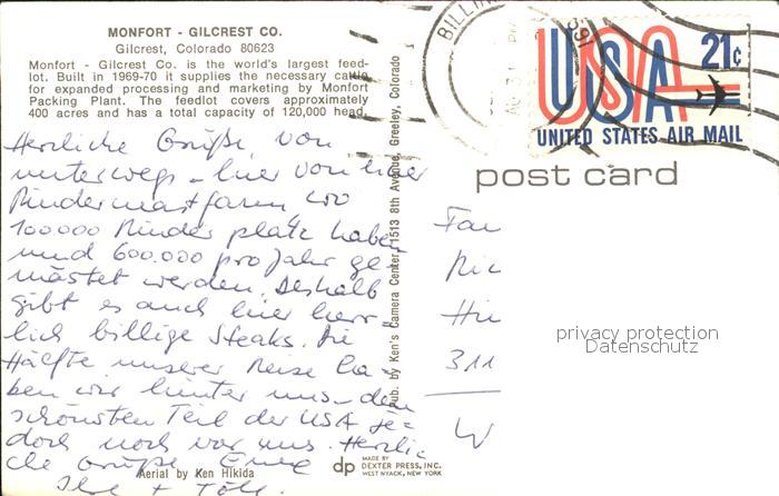 71964870 old postcard Gilcrest Fliegeraufnahme Monfort Gilcrest Co. postalisch gelaufen Erhaltung siehe scans KatCode: 14140060000000