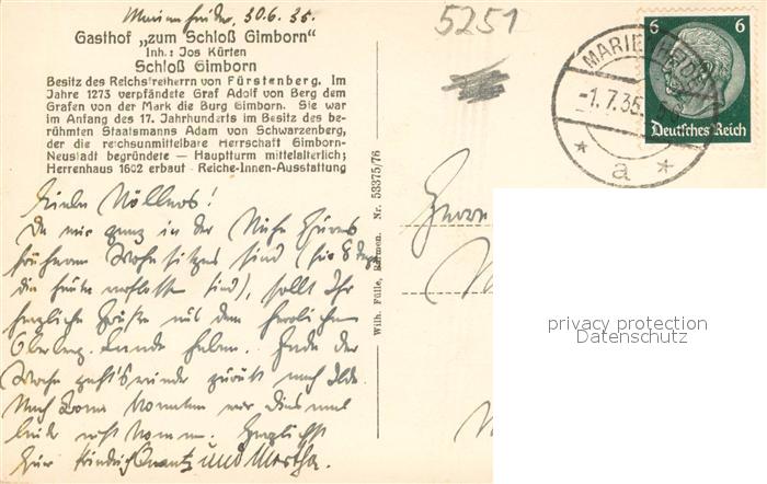 73706241 alte Postkarte Gimborn Schloss Gimborn postalisch gelaufen Erhaltung siehe scans [LiesaD40] KatCode: 11110005374024