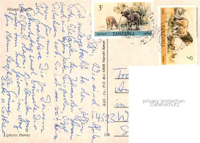 alte Postkarte Giraffe Maasai Giraffe postalisch gelaufen Erhaltung siehe scans [PaolaD17]