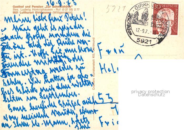 73543721 alte Postkarte Girkhausen Bad Berleburg Gasthof Pension Zur Schmelzhuette postalisch gelaufen Erhaltung siehe scans [FriedD77] KatCode: 11110005970004