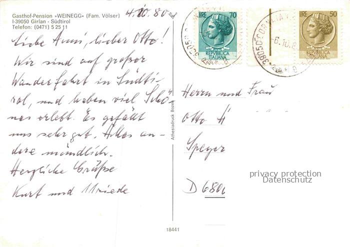 74012499 old postcard Girlan Gasthof Pension Weinegg postalisch gelaufen Erhaltung siehe scans [WerneD78] KatCode: 11240