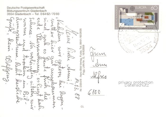 73319905 alte Postkarte Gladenbach Hessen Bildungszentrum Deutsche Postgewerkschaft Fliegeraufnahme postalisch gelaufen Erhaltung siehe scans [FriedD77] KatCode: 11110006534010