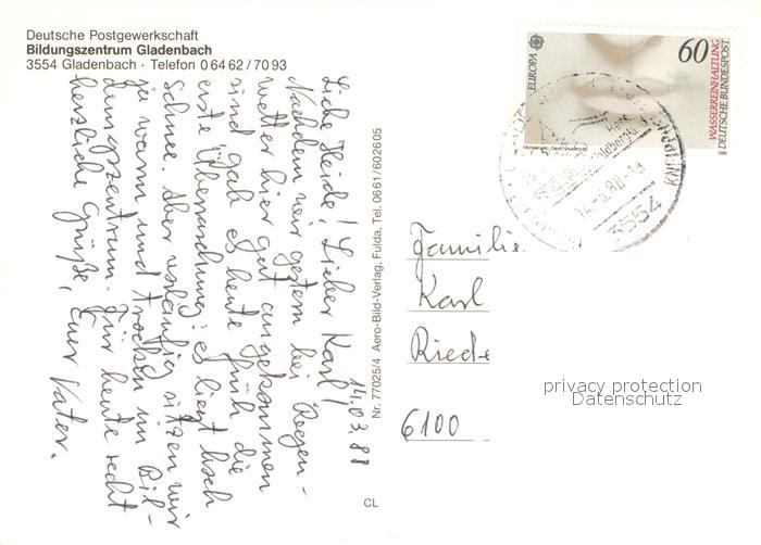 73543122 alte Postkarte Gladenbach Hessen Bildungszentrum Hallenbad postalisch gelaufen Erhaltung siehe scans [FriedD77] KatCode: 11110006534010