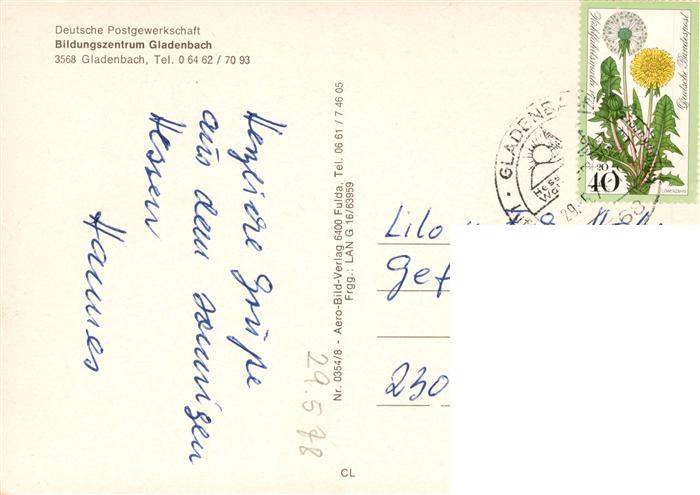 73917347 Gladenbach Hessen Deutsche Postgewerkschaft Bildungszentrum postalisch gelaufen Fliegeraufnahme Erhaltung siehe scans [FriedD77] Fliegeraufnahme alte Postkarte Frie Katcode 11110006534010
