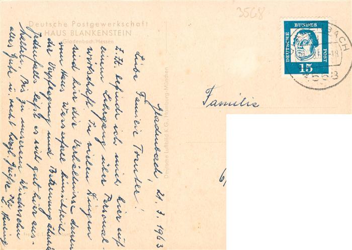 73936644 Gladenbach Hessen Deutsche Postgewerkschaft Haus Blankenstein postalisch gelaufen Fliegeraufnahme Erhaltung siehe scans [FriedD77] Fliegeraufnahme alte Postkarte Frie Katcode 11110006534010
