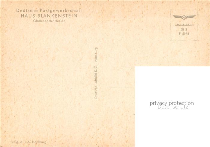 73764330 Gladenbach Hessen Dt Postgewerkschaft Haus Blankenstein Fliegeraufnahme postalisch nicht gelaufen Erhaltung siehe scans [FriedD77] Frie Katcode 11110006534010