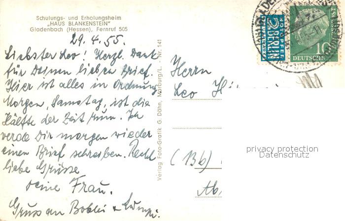 73742094 Gladenbach Hessen Erholungsheim der Dt Postgewerkschaft Haus Blankenstein postalisch gelaufen Erhaltung siehe scans [WerneD78] alte Postkarte Wern Katcode 11110006534010