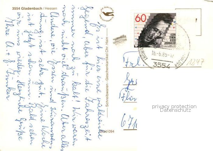 73226278 alte Postkarte Gladenbach Hessen Hotel Spiess Fachwerkhaus Kirche Haus des Gastes Schwimmbad Hallenbad postalisch gelaufen Erhaltung siehe scans [FriedD77] KatCode: 11110006534010