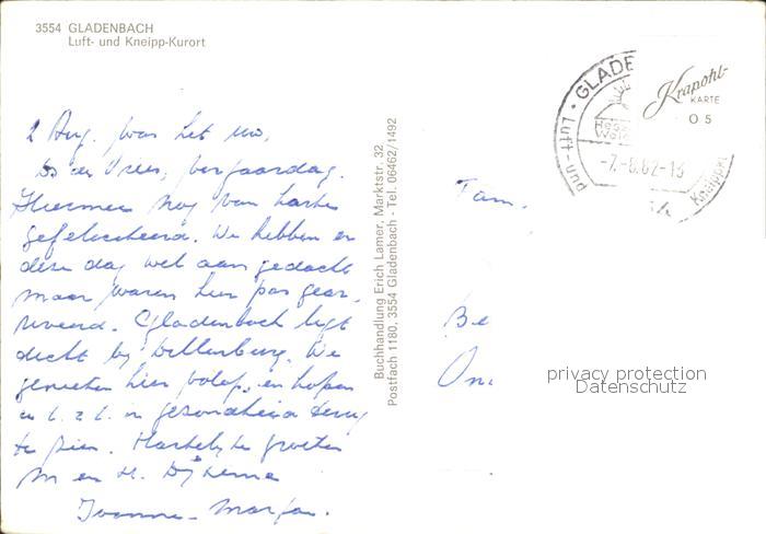 72254143 alte Postkarte Gladenbach Hessen Luft und Kneippkurort Fliegeraufnahme postalisch gelaufen Erhaltung siehe scans KatCode: 11110006534010