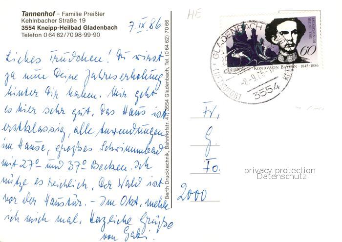 73123469 alte Postkarte Gladenbach Hessen Tannenhof postalisch gelaufen Erhaltung siehe scans [PaolaD17] KatCode: 11110006534010