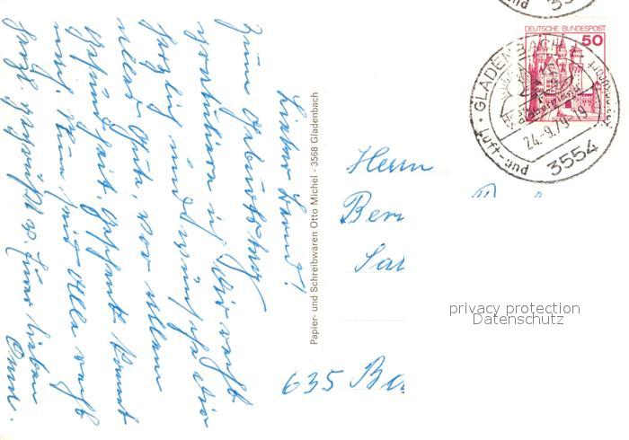 73146711 alte Postkarte Gladenbach Hessen Teilansicht Kneipp Kuranlage Hallenbad Freibad Marktstrasse Kirche postalisch gelaufen Erhaltung siehe scans [FriedD77] KatCode: 11110006534010