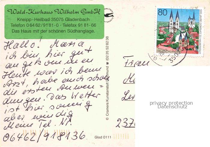 74021919 Gladenbach Hessen Wald-Kurhaus Wilhelm Rezeption Hallenbad Wassertreten Restaurant postalisch gelaufen Erhaltung siehe scans [FriedD77] alte Postkarte Frie Katcode 11110006534010