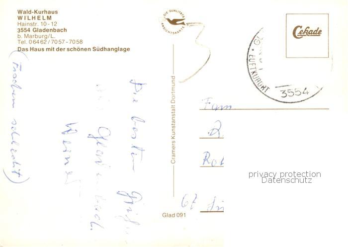 73865055 Gladenbach Hessen Wald-Kurhaus Wilhelm Rezeption Restaurant Hallenbad postalisch gelaufen Erhaltung siehe scans [FriedD77] alte Postkarte Frie Katcode 11110006534010