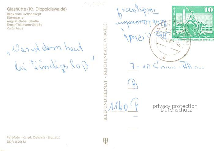 73041002 alte Postkarte Glashuette Sachsen Stadtblick Sternwarte Aug Bebel Str Thaelmann Str Kulturhaus postalisch gelaufen Erhaltung siehe scans [WerneD78] KatCode: 11110014290150