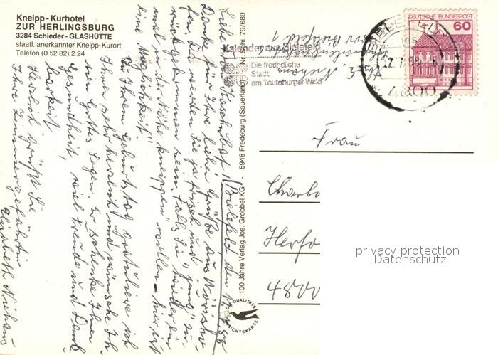 73111927 alte Postkarte Glashuette Schieder Kurhotel Zur Herlingsburg postalisch gelaufen Erhaltung siehe scans [NatalD47] KatCode: 11110005766060
