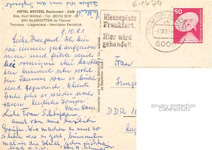 73867172 alte Postkarte Glashuetten Taunus Hotel Weitzel Restaurant Cafe postalisch gelaufen Erhaltung siehe scans [FriedD77] KatCode: 11110006434003