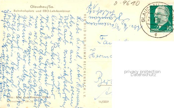 43494770 alte Postkarte Glauchau Bahnhofsplatz und EBO Lehrkombinat postalisch gelaufen Erhaltung siehe scans [WerneD78] KatCode: 11110014173070