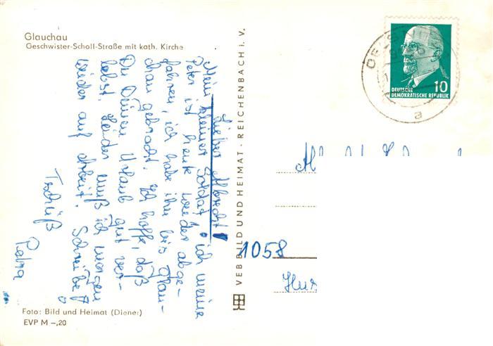 73871219 alte Postkarte Glauchau Geschwister Scholl Strasse mit kath Kirche postalisch gelaufen Erhaltung siehe scans [FriedD77] KatCode: 11110014173070