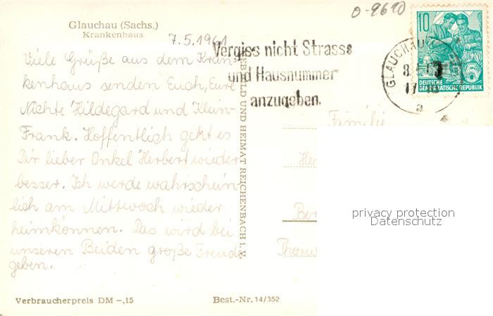 43348092 alte Postkarte Glauchau Krankenhaus postalisch gelaufen Erhaltung siehe scans [KathaD81] KatCode: 11110014173070