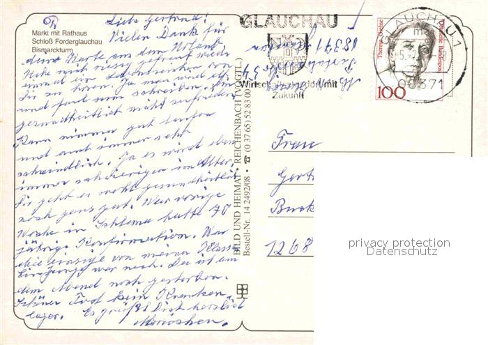 72687388 alte Postkarte Glauchau Markt mit Rathaus Schloss Bismarckturm postalisch gelaufen Erhaltung siehe scans [FriedD77] KatCode: 11110014173070