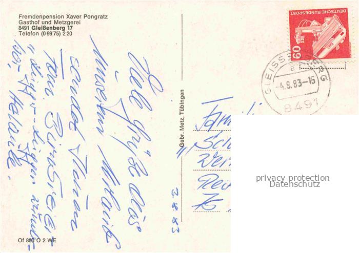 74049639 alte Postkarte Gleissenberg Oberpfalz Gasthof Pension Pongratz Gastraum Terrasse Landschaftspanorama postalisch gelaufen Erhaltung siehe scans [FriedD77] KatCode: 11110009372128